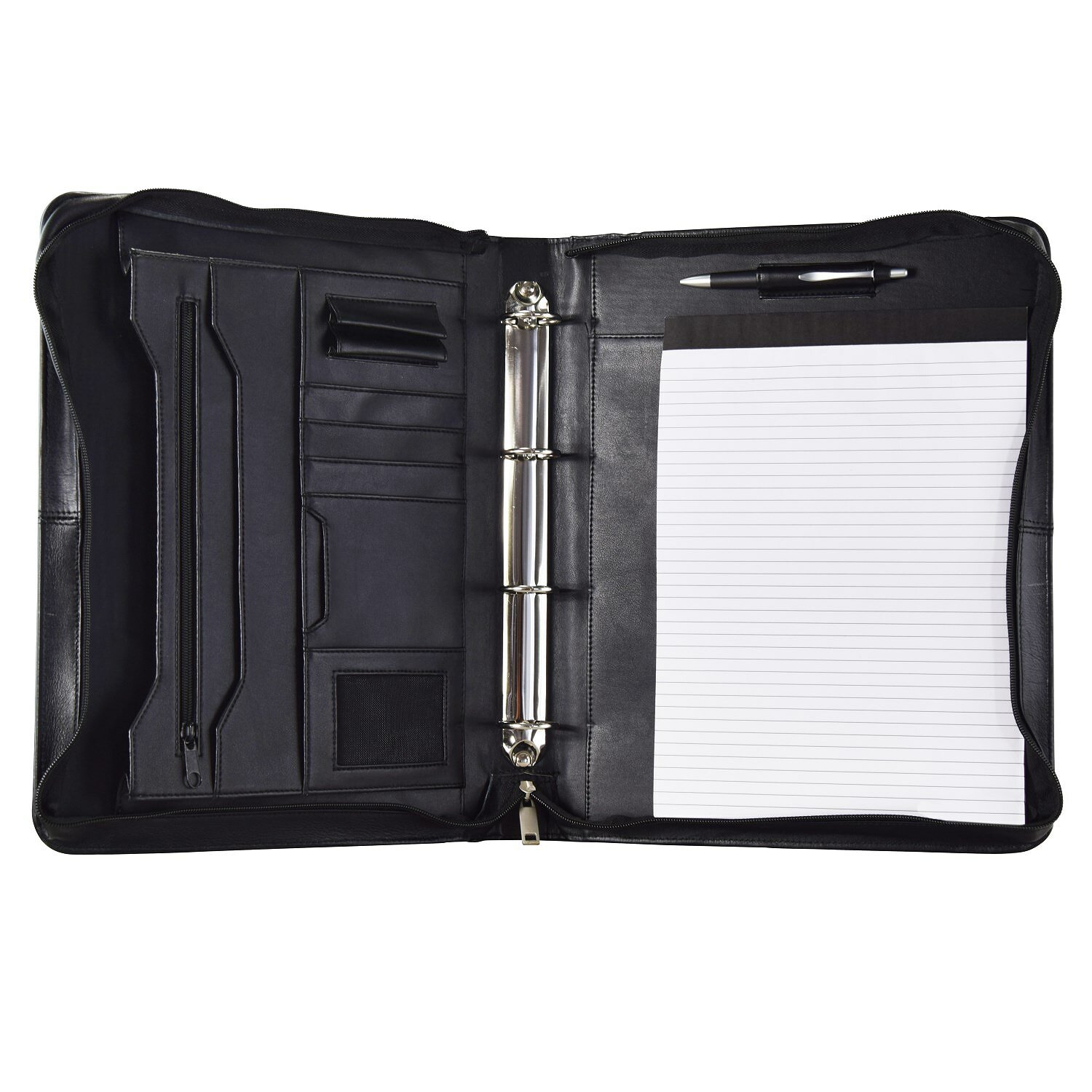 Chemise à fermeture éclair A4 en cuir - au milieu 4 mécanismes à anneaux - diverses pochettes - bloc-notes inclus - 1 compartiment avec fermeture éclair - 2 poches pour stylos - pochettes pour cartes de visite - sur le devant, 1 compartiment (les équipements présentés sur les photos, tels que les téléphones portables, les blocs-notes, etc. ne sont pas inclus).