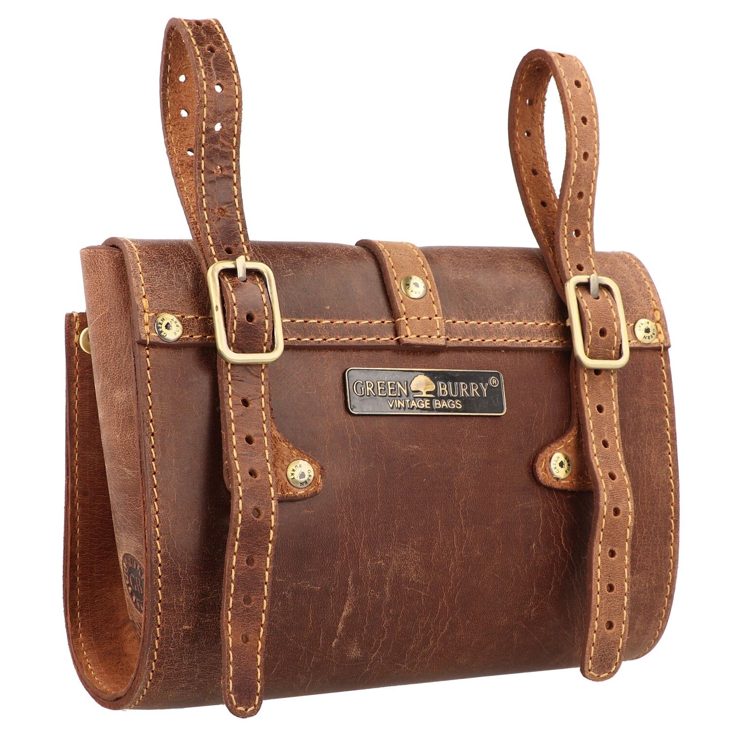 Sacoche de vélo Greenburry de haute qualité en cuir véritable au look vintage. Elle possède deux pattes réglables à fixer sur le guidon et convient parfaitement pour ranger des outils ou de petits objets.