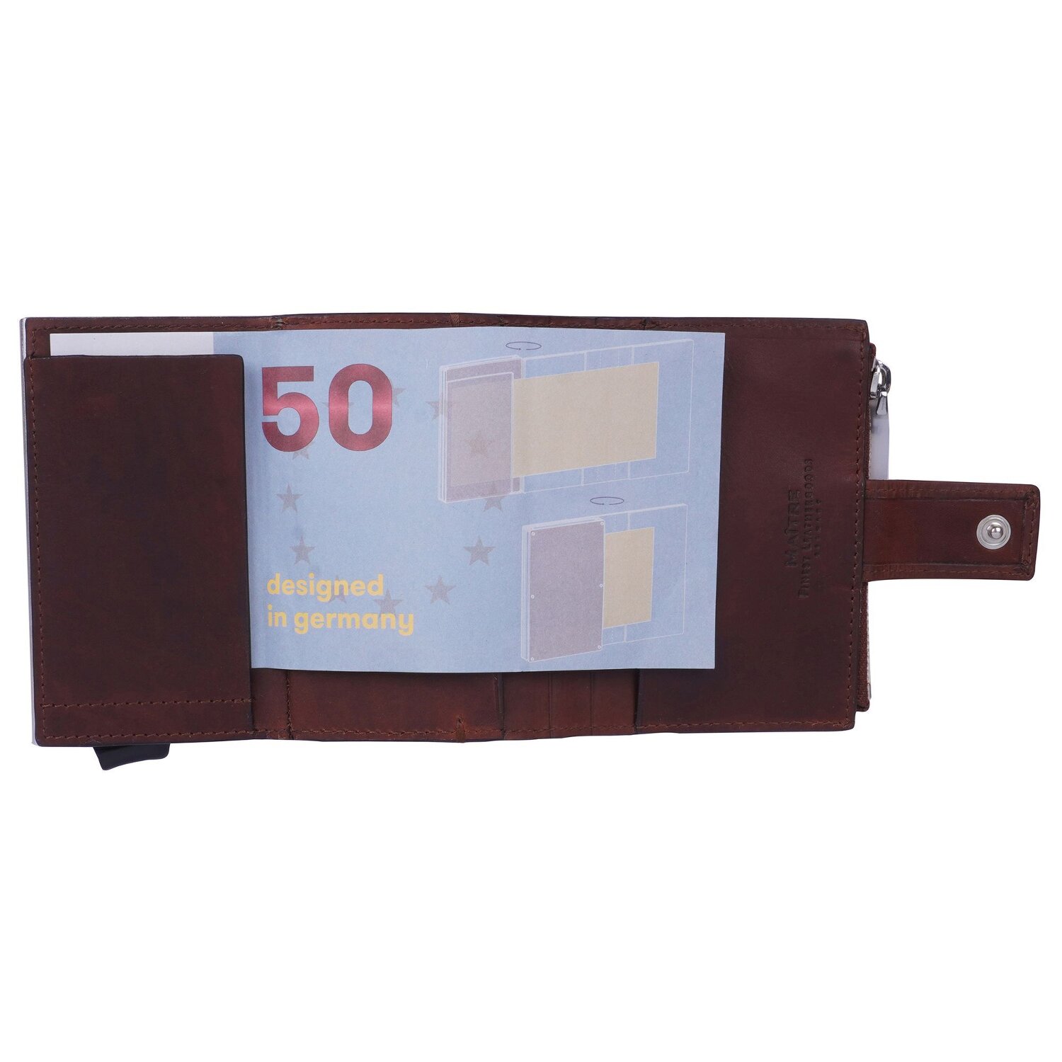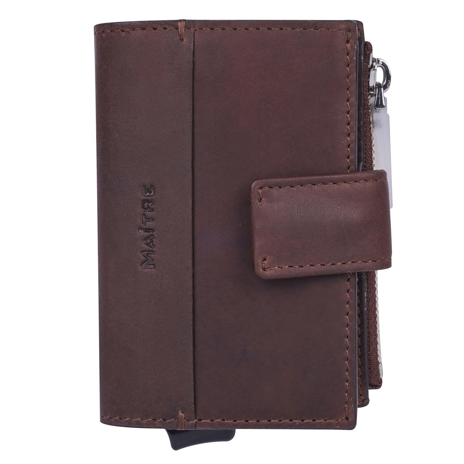 Design compact et élégant, qualité supérieure et sécurité s'unissent dans ce porte-cartes de crédit en cuir de Maître. Le compartiment pour cartes de crédit peut contenir jusqu'à 6 cartes, qui glissent dans l'ordre sur simple pression d'un bouton. L'étui dispose en outre de trois autres compartiments. L'étui se ferme en toute sécurité par un bouton-pression.