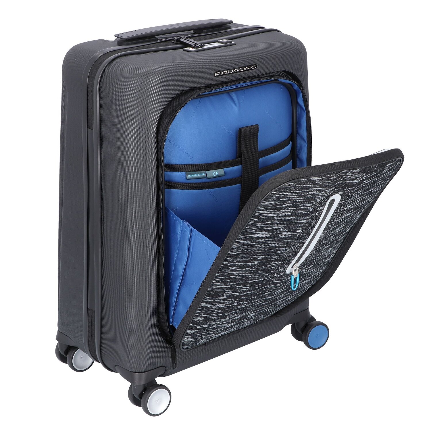 Trolley cabine sophistiqué de la série Bagmotic de Piquadro. Cette valise est équipée d'une banque d'énergie de 6000 mAh et peut accueillir une tablette ou un ordinateur portable.