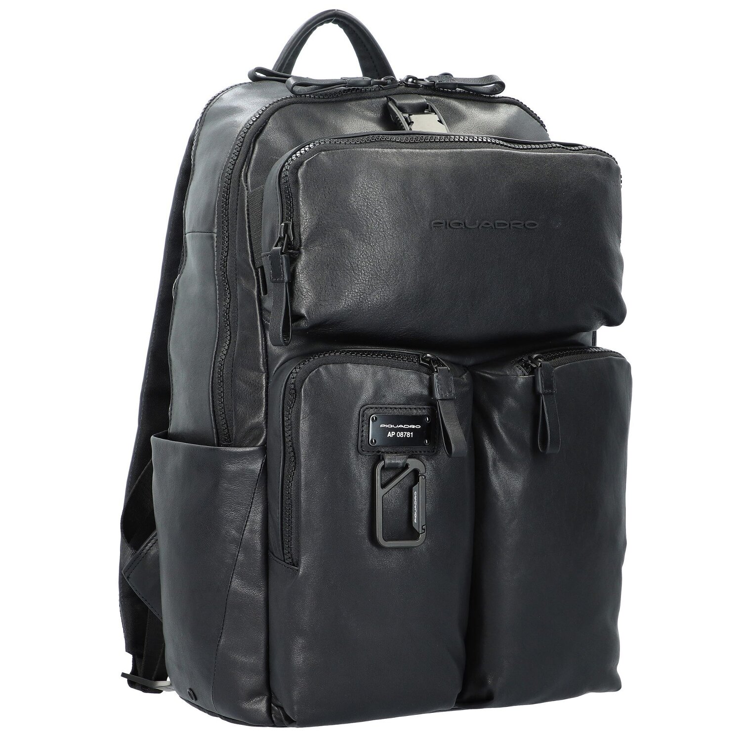 Sac à dos d'affaires stylé et spacieux de la marque Piquadro en cuir de haute qualité. Les deux compartiments principaux offrent suffisamment de place pour toutes sortes d'objets quotidiens et disposent d'un compartiment pour tablette rembourré ainsi que de diverses poches à l'intérieur pour les téléphones portables par exemple. Les compartiments sur le devant offrent un espace de rangement supplémentaire. Les compartiments latéraux sont parfaits pour ranger des parapluies de poche ou des bouteilles d'eau. Le rembourrage dorsal assure le confort lors du transport et la possibilité d'accrocher un trolley fait également de ce sac à dos un excellent compagnon de voyage.